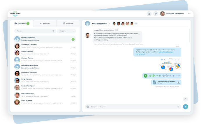 Корпоративные коммуникации стали гораздо проще с ComCoord. Моментальные сообщения, групповая работа, ведение проектов, информирование и общение, управление доступами — все это в рамках одной системы с полным шифрованием всех данных.