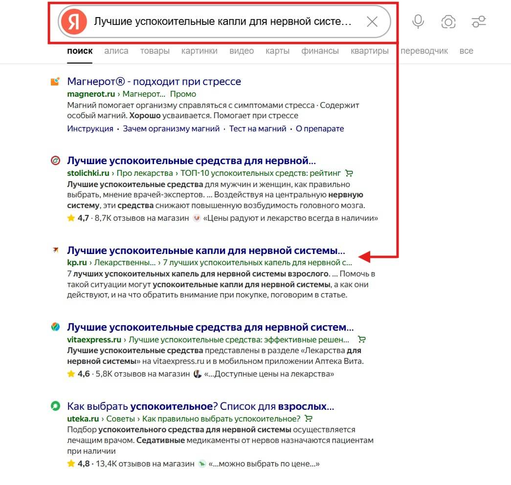 - Статья с обзором брендов «Лучшие успокоительные капли для нервной системы взрослого» на КП.ру также показала высокий CTR — около 3,9%.
