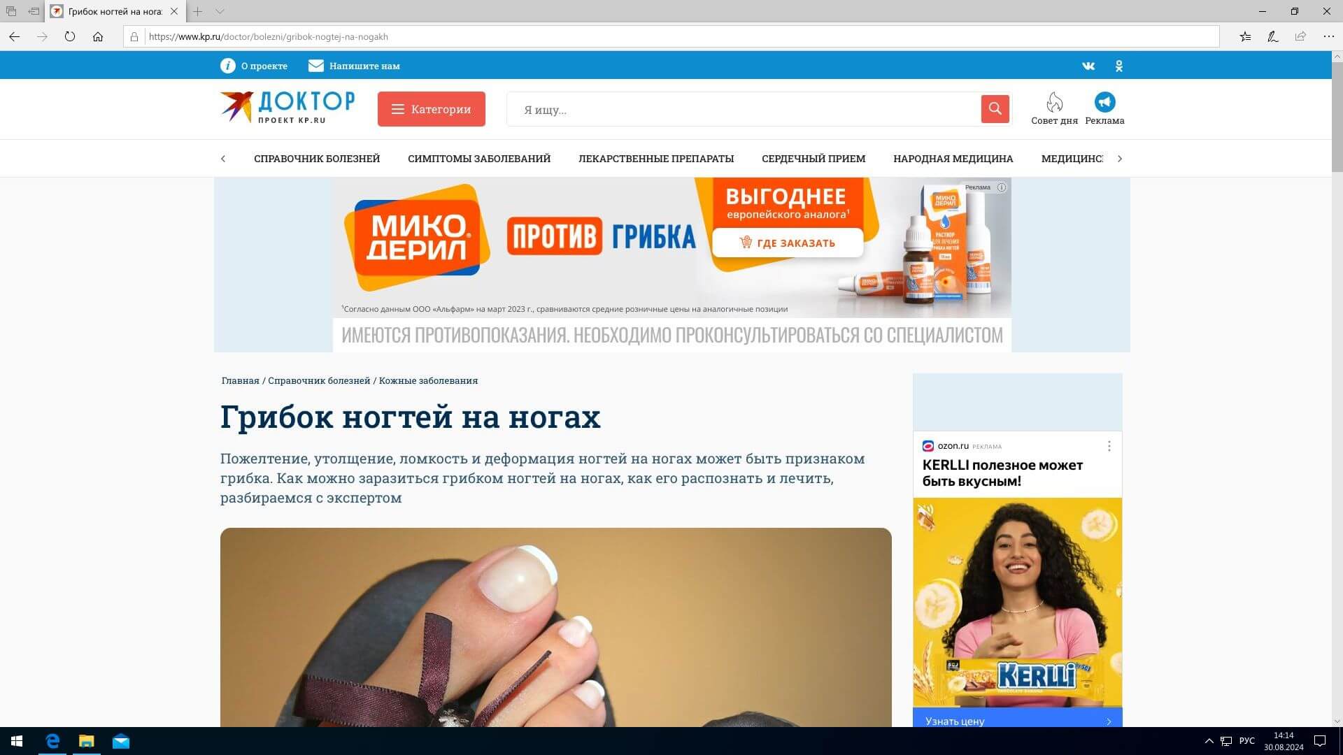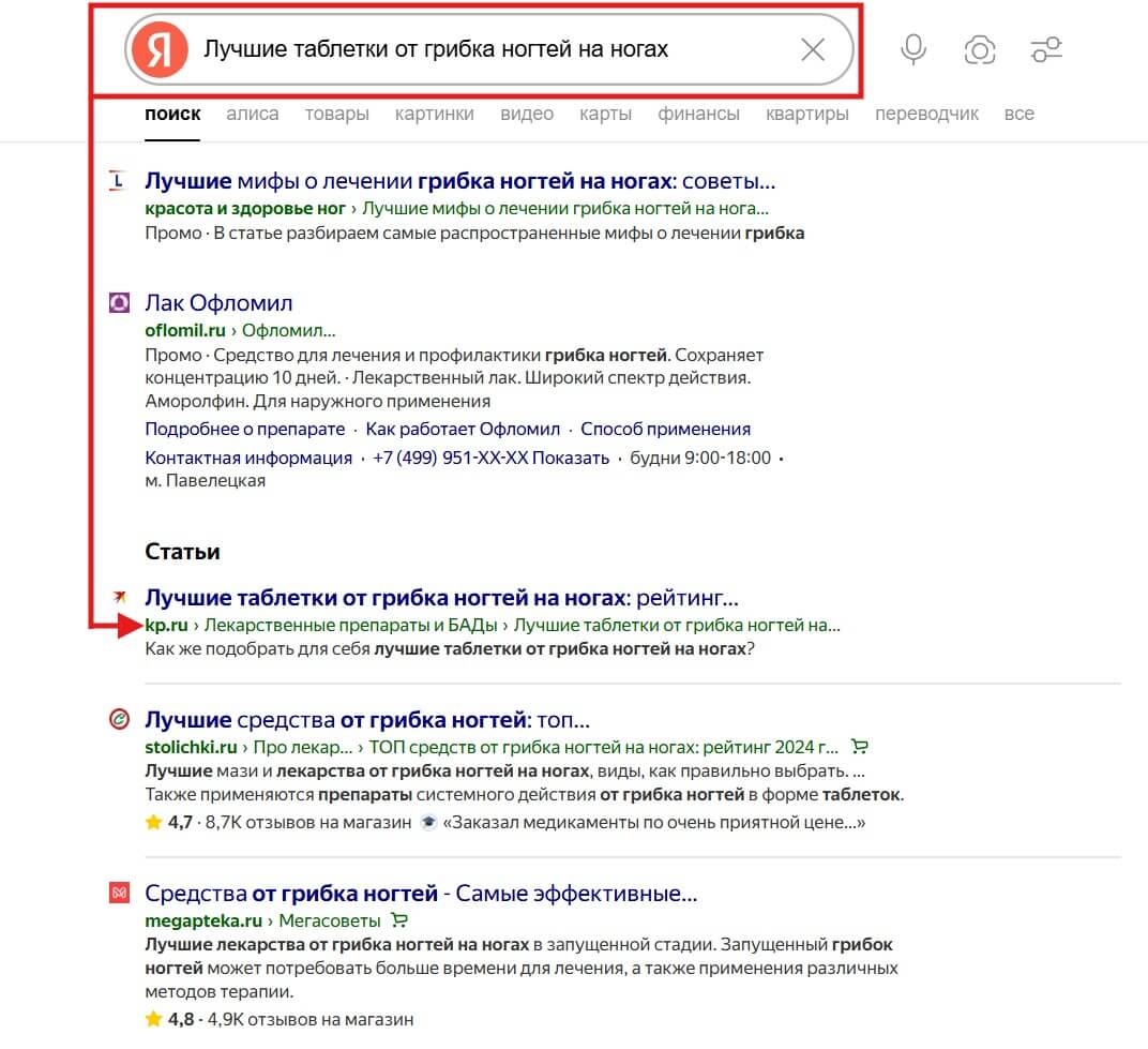 - Материал «Лучшие таблетки от грибка ногтей на ногах» (kp.ru) — 50 000+ показов, существенный вклад в целевой охват.